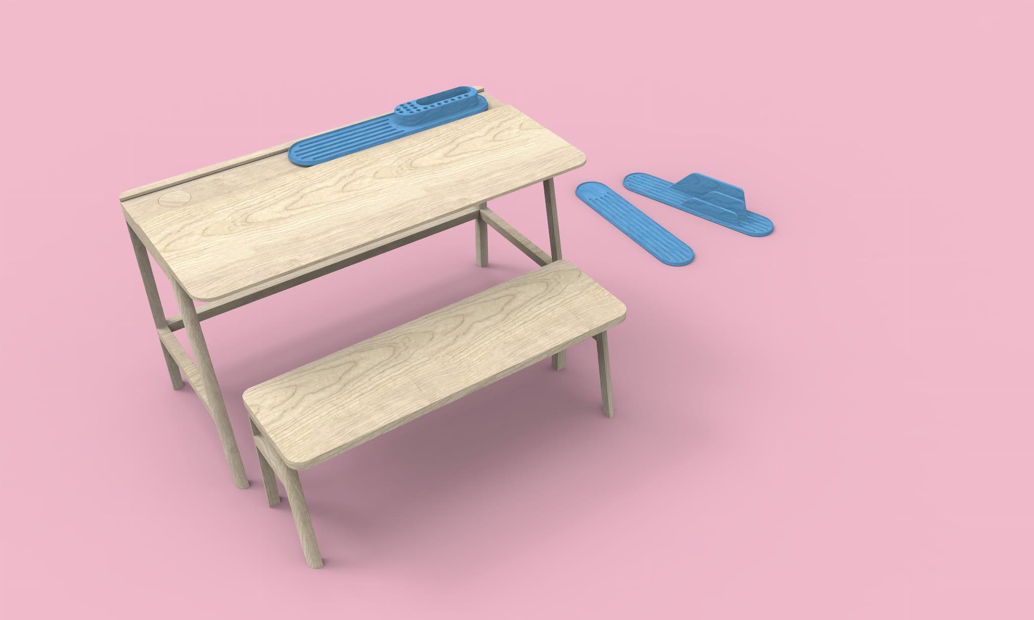 Dzięki kolekcji Vessel Alainowi Gillesowi udało się połączyć prostotę, elegancję, jakość, tradycję i nowoczesność. Wykonane z dębu, które przywodzą na myśl dawne klasy, biurka i ławki Vessel są wyposażone w zabawne akcesoria, takie jak komin lub nadbudowa statku do przechowywania długopisów, puzonów, smartfona, tabletu, gwizdków lub kasztanów zebranych podczas spaceru po lesie. Najbardziej pomysłowi sprawią, że małe pociągi będą jeździć wzdłuż rowków; najbardziej tajemniczy będą zachwyceni swoją skrzynią ze skarbami.