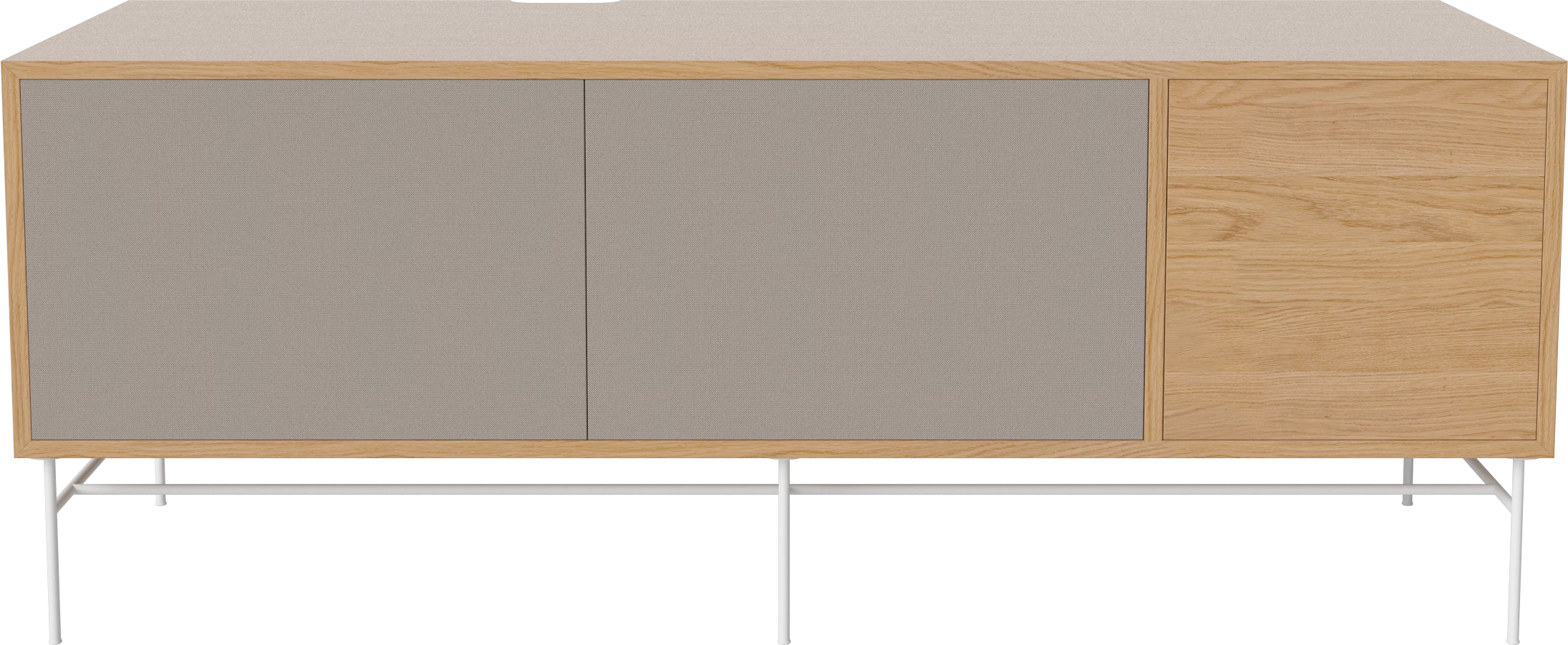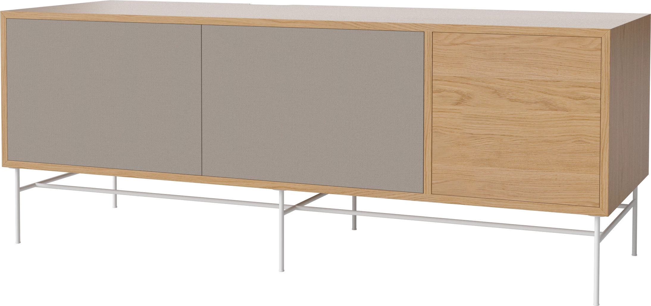 dąb naturalny olejowany, biała podstawa, szare fronty z tkaniny
