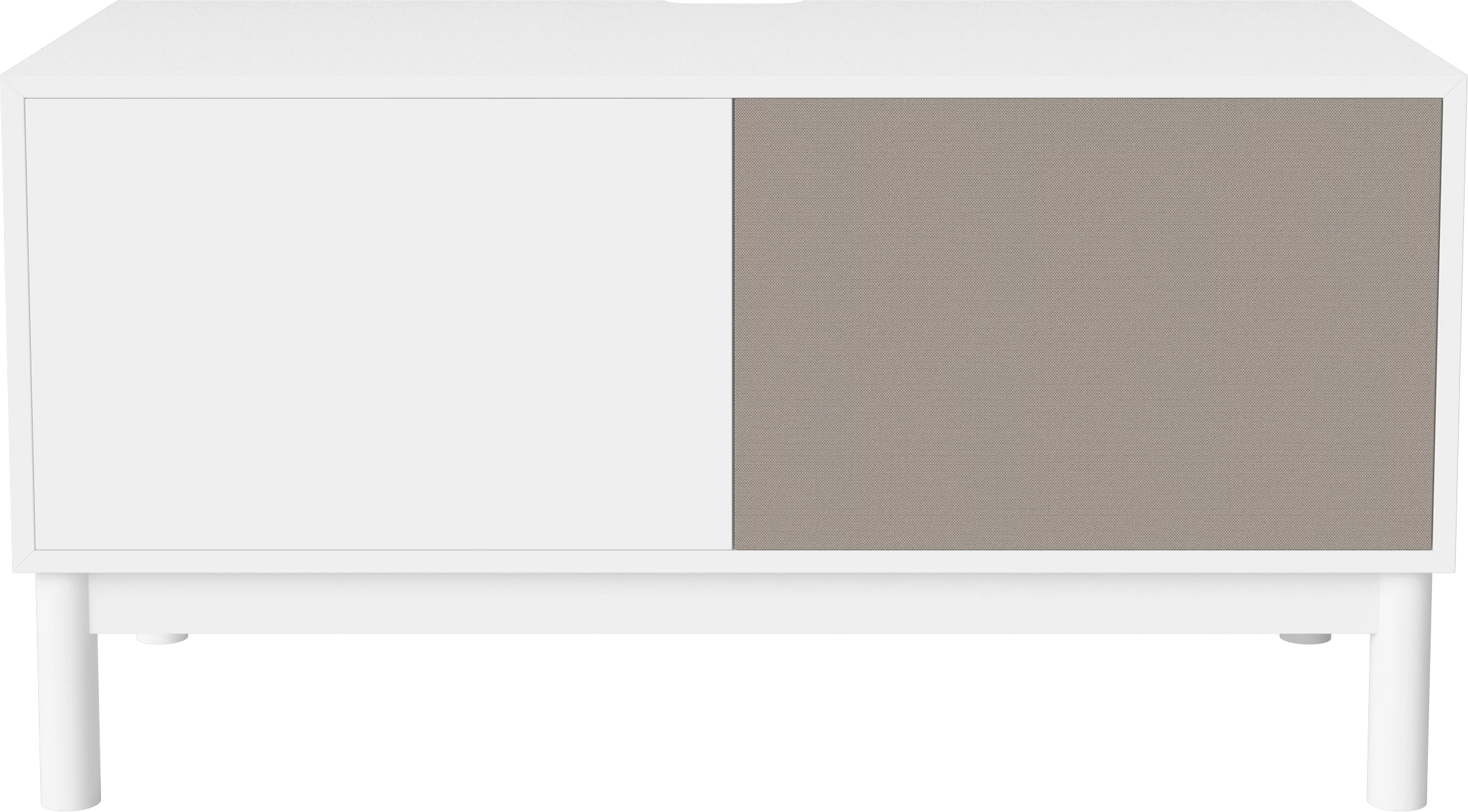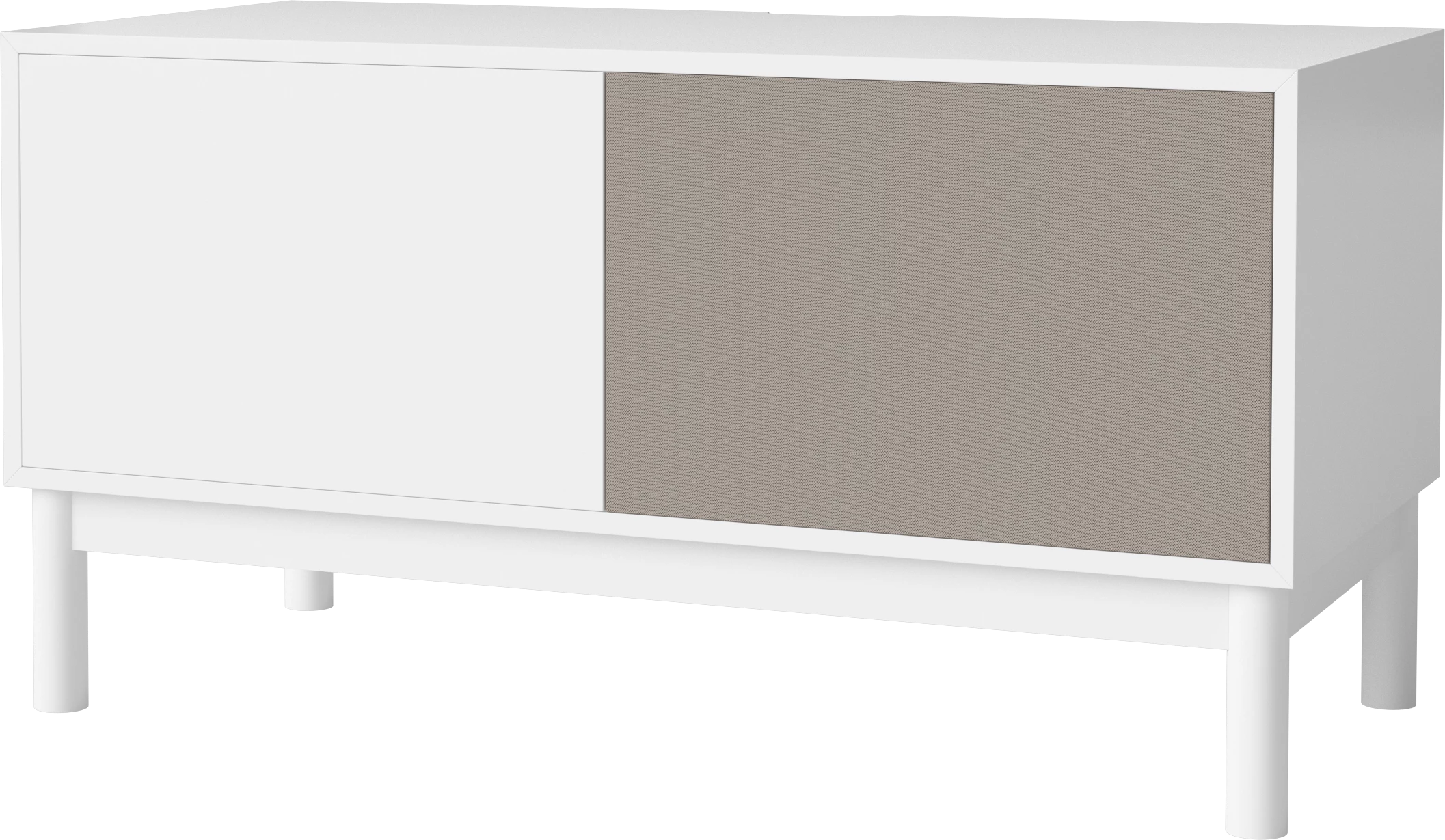 biały korpus, biała dębowa podstawa, fronty szara tkanina i biały MDF