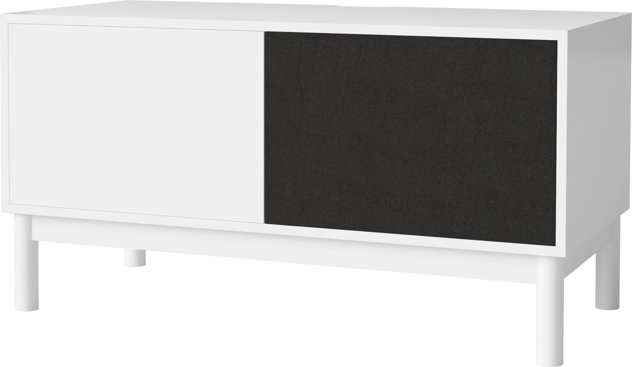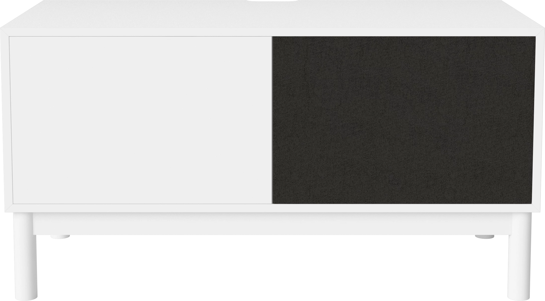 biały korpus, biała dębowa podstawa, fronty czarna tkanina i biały MDF