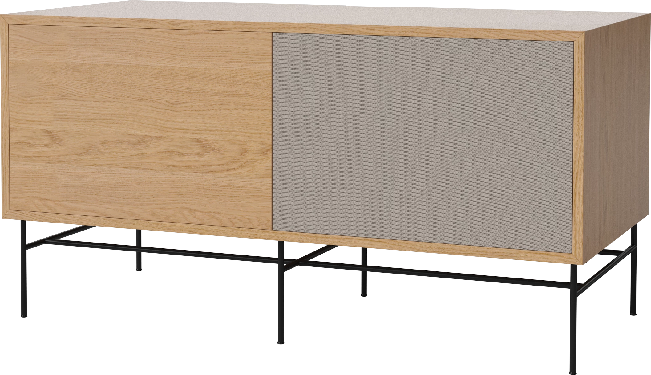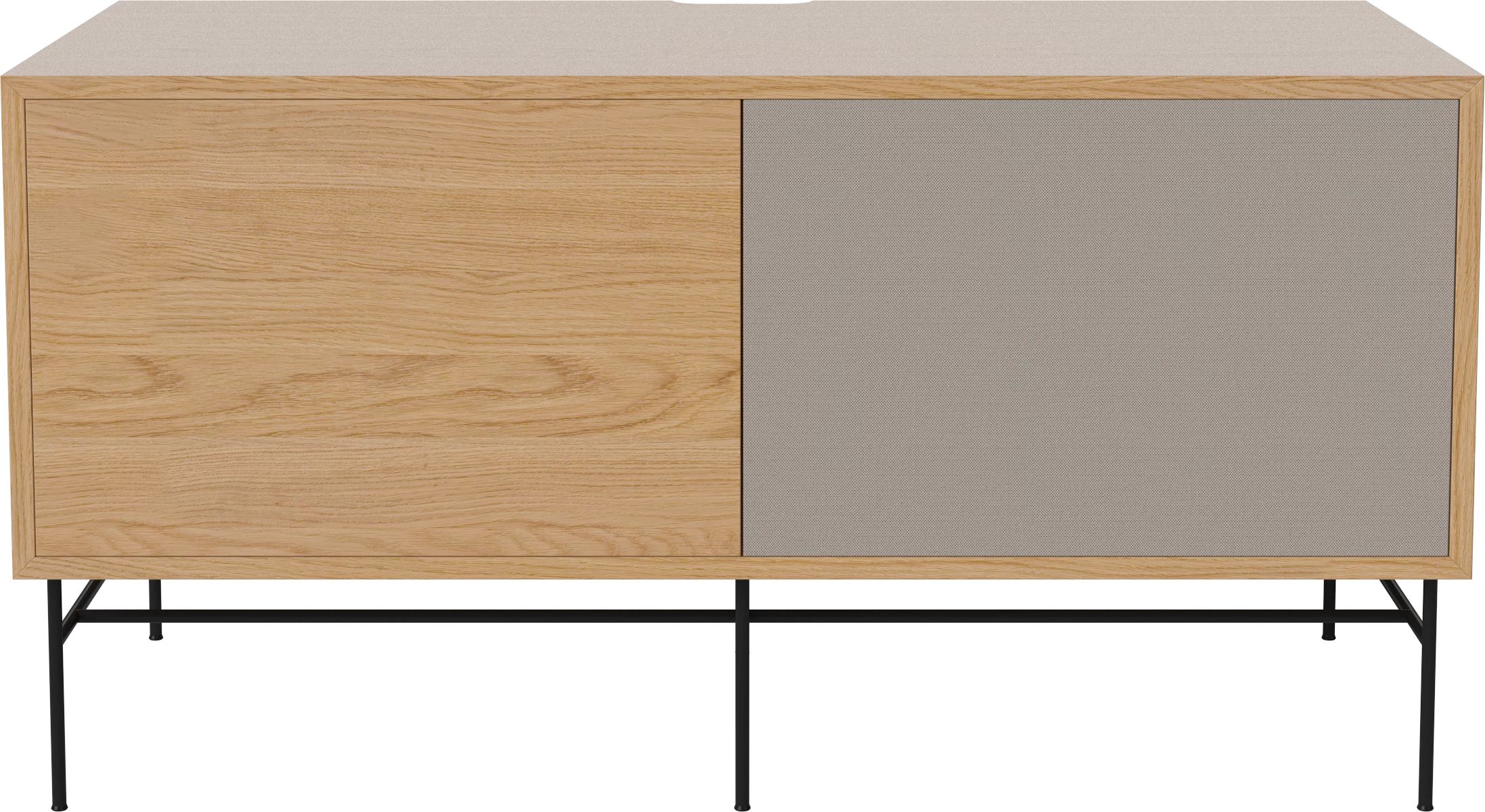 dąb naturalny olejowany, czarna podstawa, front szara tkanina i dąb naturalny