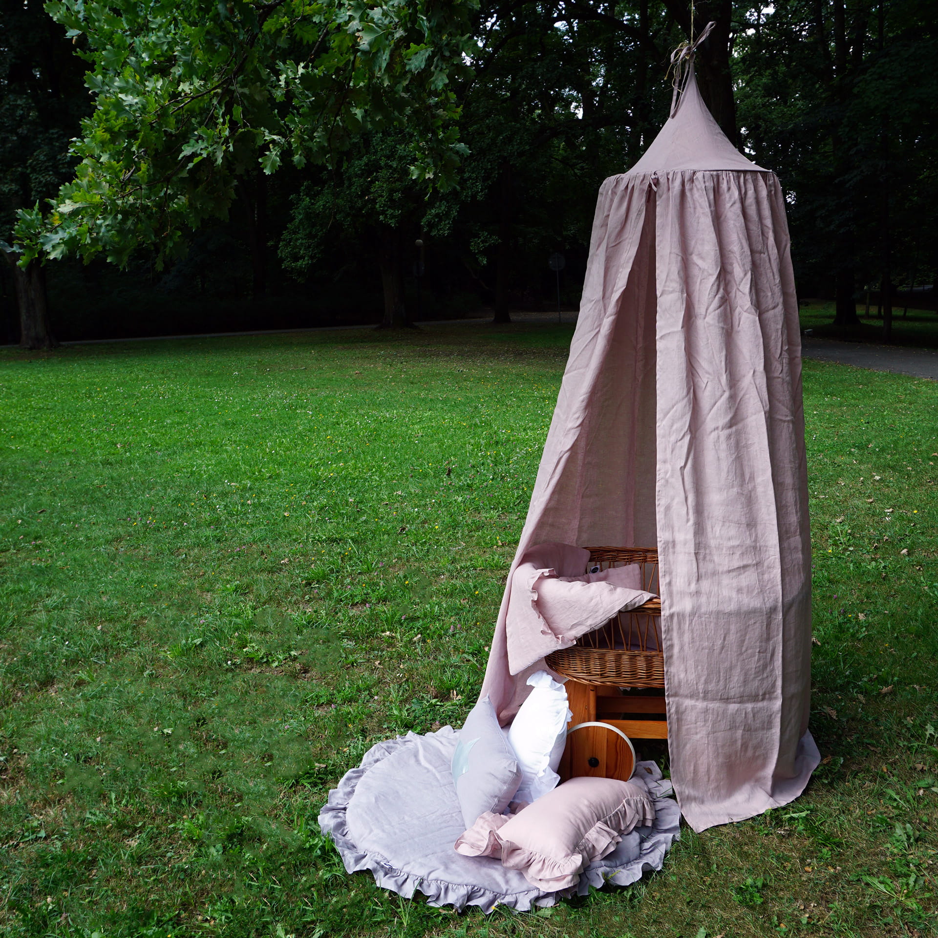 Do baldachimu możesz dobrać lnianą matę z falbanką lub lnianą matę liść. Będą tworzyć razem piękny zestaw.