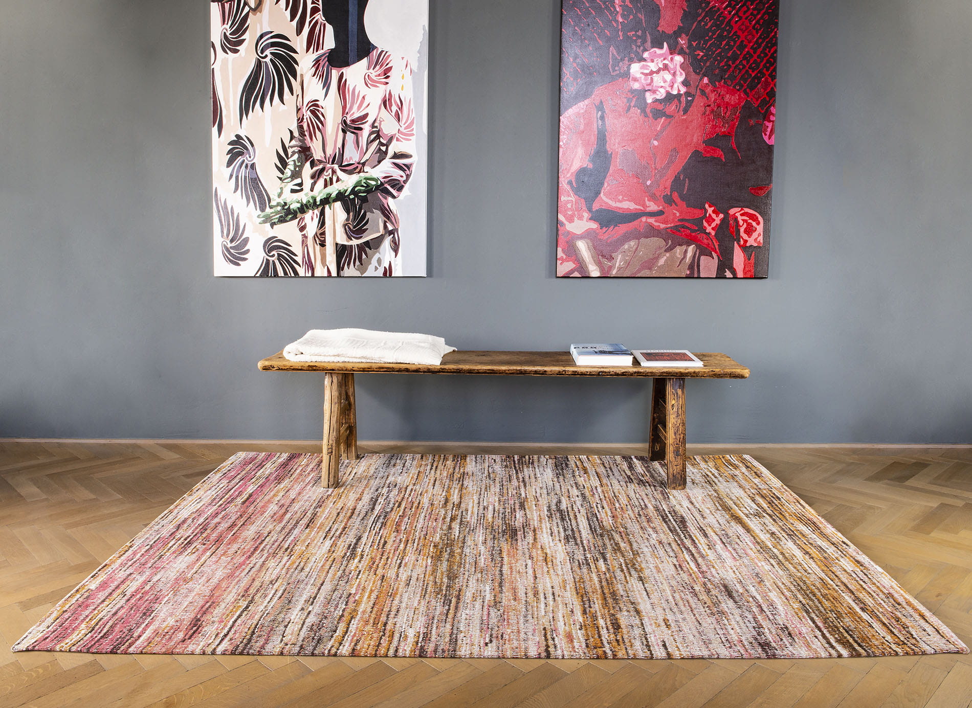 Tkanie na płasko gęstym szwem metodą żakardowego splotu pozwala uzyskać bardzo szczegółowy i pełen detali wzór, jednocześnie zapewniając wytrzymałość oraz, większą niż w grubych dywanach, odporność na odkształcenia pod ciężarem mebli. Ponadto dywan łatwo utrzymać w czystości ze względu na niskie runo, które bez trudu da się odkurzać. Dzięki kauczukowej powłoce na spodzie dywanu, dywan jest stabilny i nie przesuwa się.