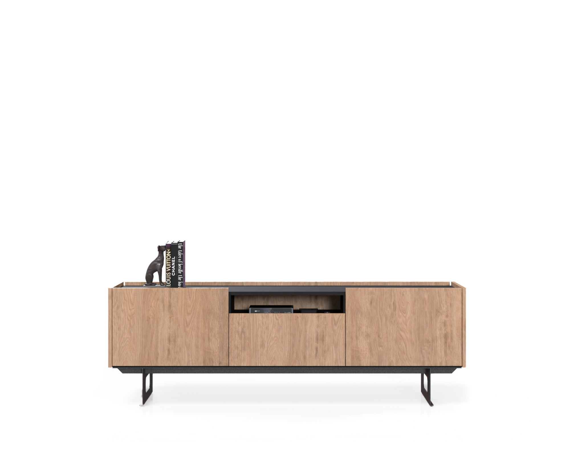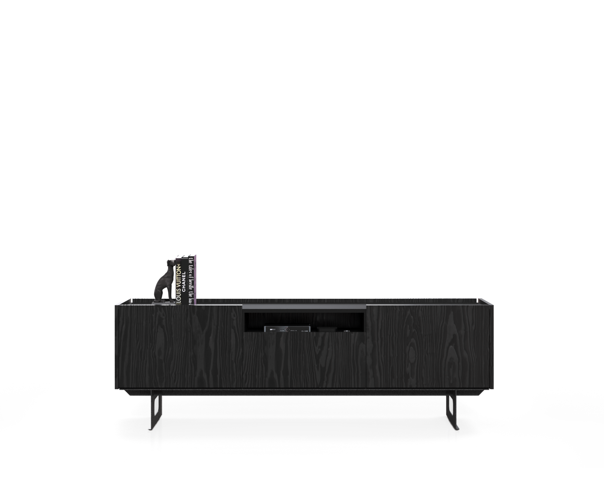 Deco RTV - zaprojektowana z myślą o pomieszczeniu sprzętu RTV. Niepodważalnie idealne połączenie funkcjonalności z designem.Mebel składa się z 2 szafek wewnątrz podzielonych półkami oraz klapy z systemem barkowym. Ponadto posiada również otwartą półkę do umieszczenia dekodera. Zaś w tylnej części komody znajduje się otwór umożliwiający sprawne przeciągnięcie kabli. Solidna konstrukcja została umieszczona na stalowym stelażu. Odbicie światła podkreśla głębie żłobień włoskiej laminowanej płyty, a półki i górna część komody wykonane są z zachwycająco miękkiego materiału posiadającego strukturę przypominającą skórę.