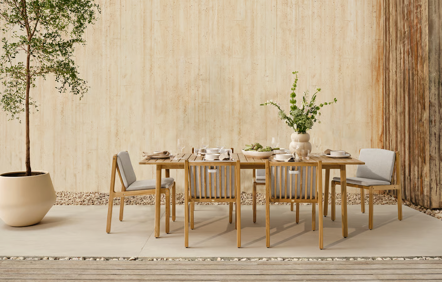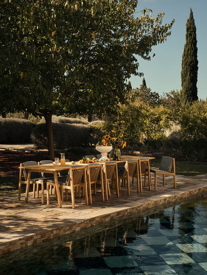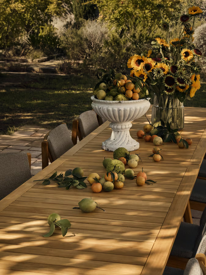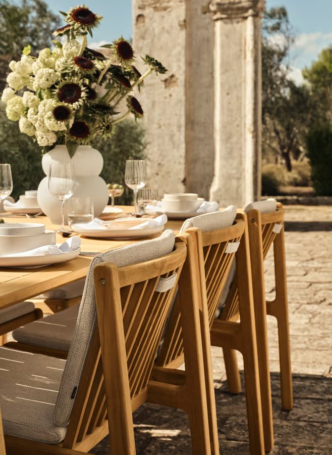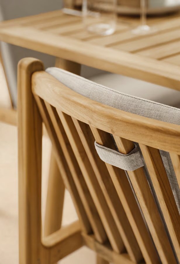 Seria Patio outdoor, zaprojektowana, by podnieść poziom Twoich doświadczeń na świeżym powietrzu dzięki wzorom inspirowanym Skandynawem, oferuje wysokiej jakości materiały i komfort. Wykonany z litego, certyfikowanego przez FSC™ teaku, znanego ze swojej trwałości i ciepłej estetyki, z czasem naturalnie nabiera szarej patyny, jeśli nie zostanie impregnowany, nadając mu postarzały wygląd. Aby zachować jego bogaty, złocistobrązowy kolor, zaleca się regularne olejowanie. Dla maksymalnego komfortu wzbogać swoje doświadczenia na świeżym powietrzu dzięki naszej pasującej serii poduszek Patio. Prezentując uczciwą konstrukcję i przemyślany design, seria zaprasza do uznania z każdej strony, jednocześnie zachęcając do tworzenia niezapomnianych chwil w przestrzeni plenerowej.
