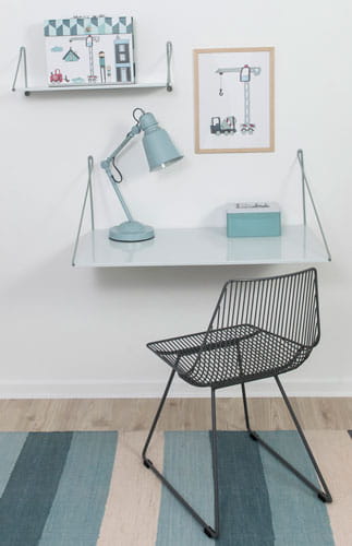Podwieszana, metalowa półka w błękitno szarym kolorze. Doskonale sprawdza się jako półka na książki, płyty, zabawki lub artykuły pielęgnacyjne przy mniejszym dziecku. Półka pasuje kolorystycznie do innych produktów firmy Sebra (dywanu, lamp, pudełek, pościeli, poduszek).