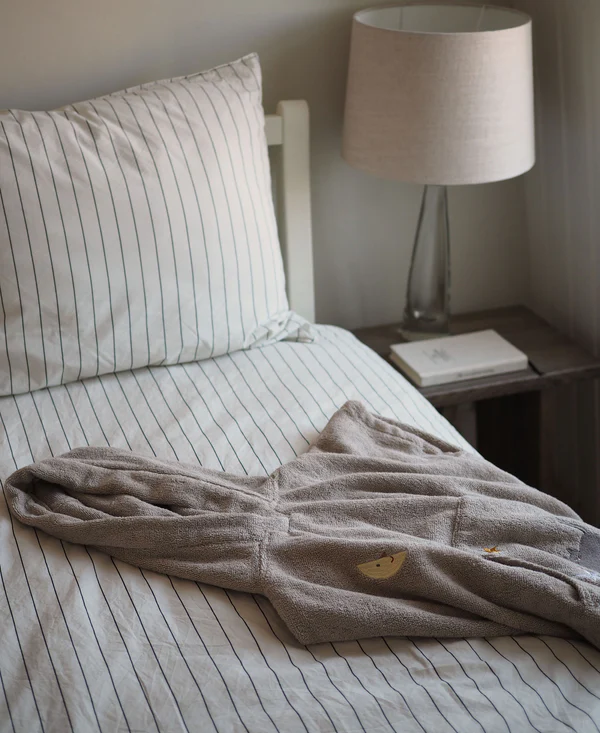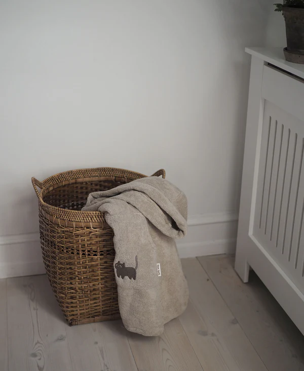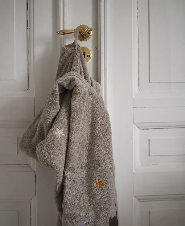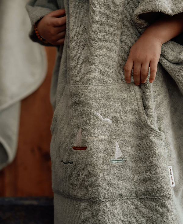 Przytulne ponczo kąpielowe wykonane z grubej i miękkiej frotte ze stałym kapturem i kieszenią kangurkę. Łatwe do naciągnięcia przez głowę dziecka po kąpieli lub na plaży. Ponczo posiada niewielkie, delikatne hafty inspirowane naturą i outdoorem.
