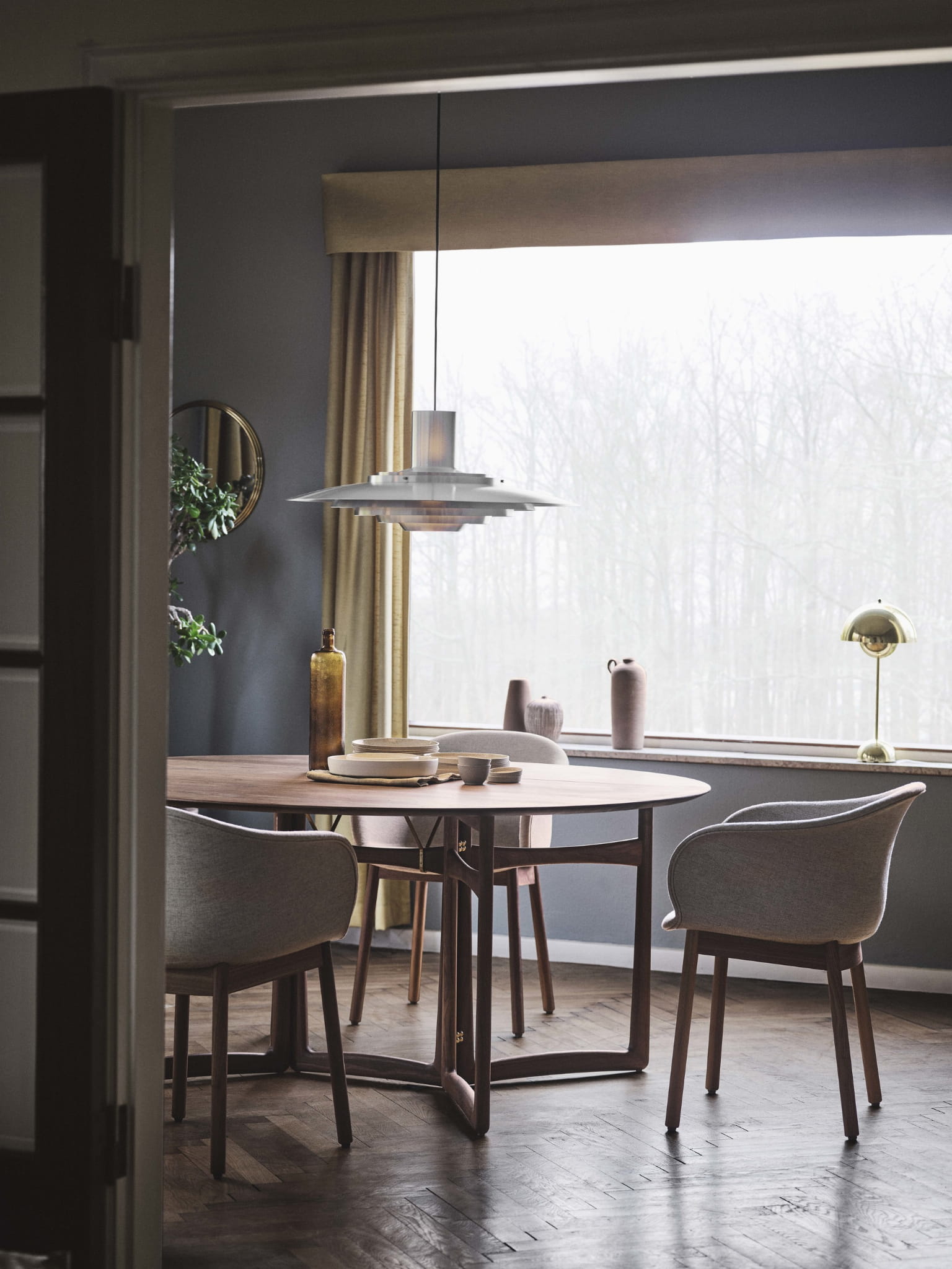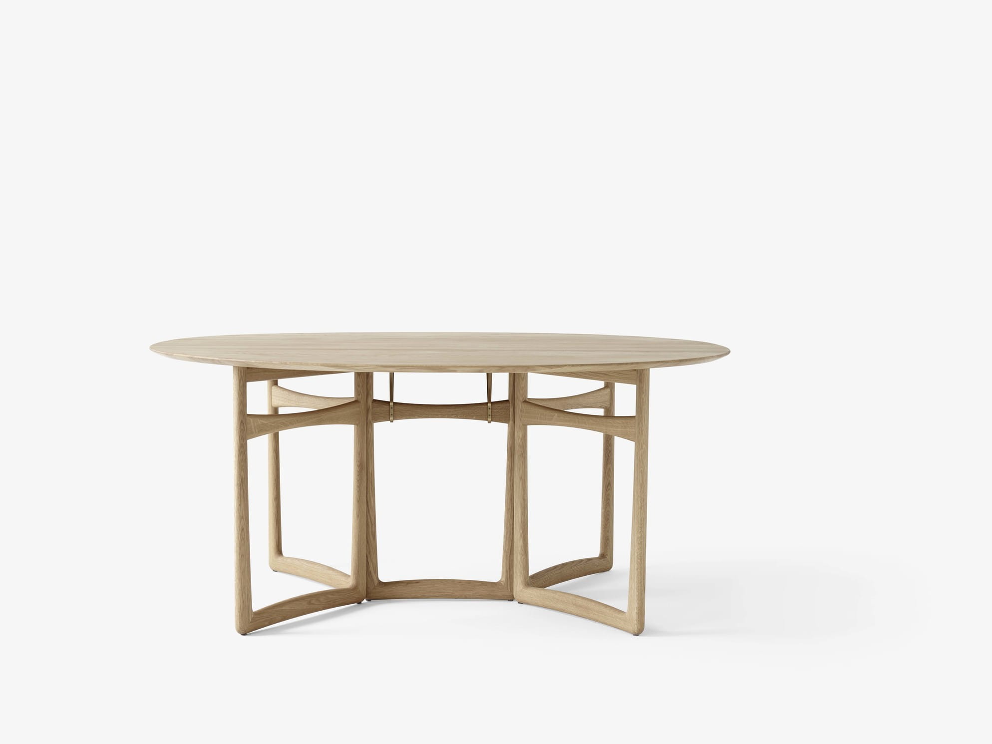 Duet projektowy Hvidt & Mølgaard opracował projekt Drop Leaf w 1956 roku. Podstawa stołu i blat wykonane są z frezowanego litego drewna. Zawiasy i okucia wykonane są z mosiądzu.