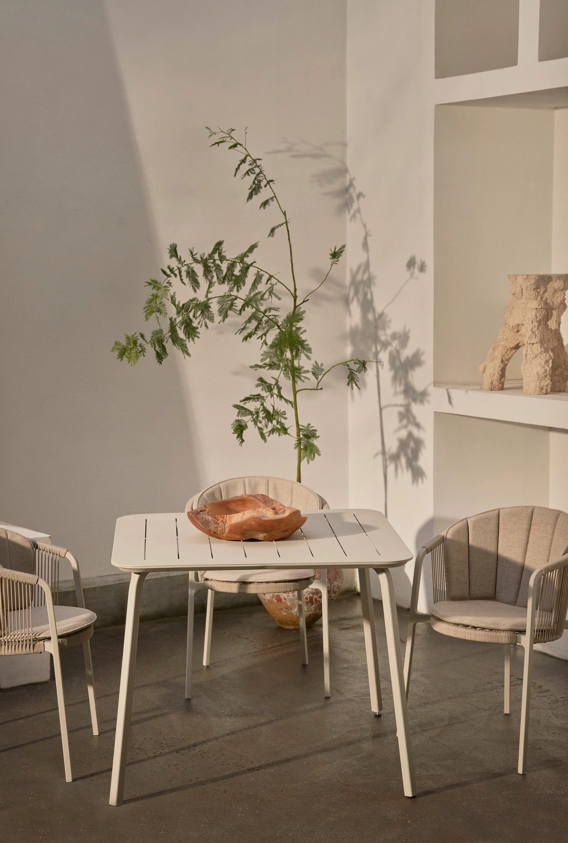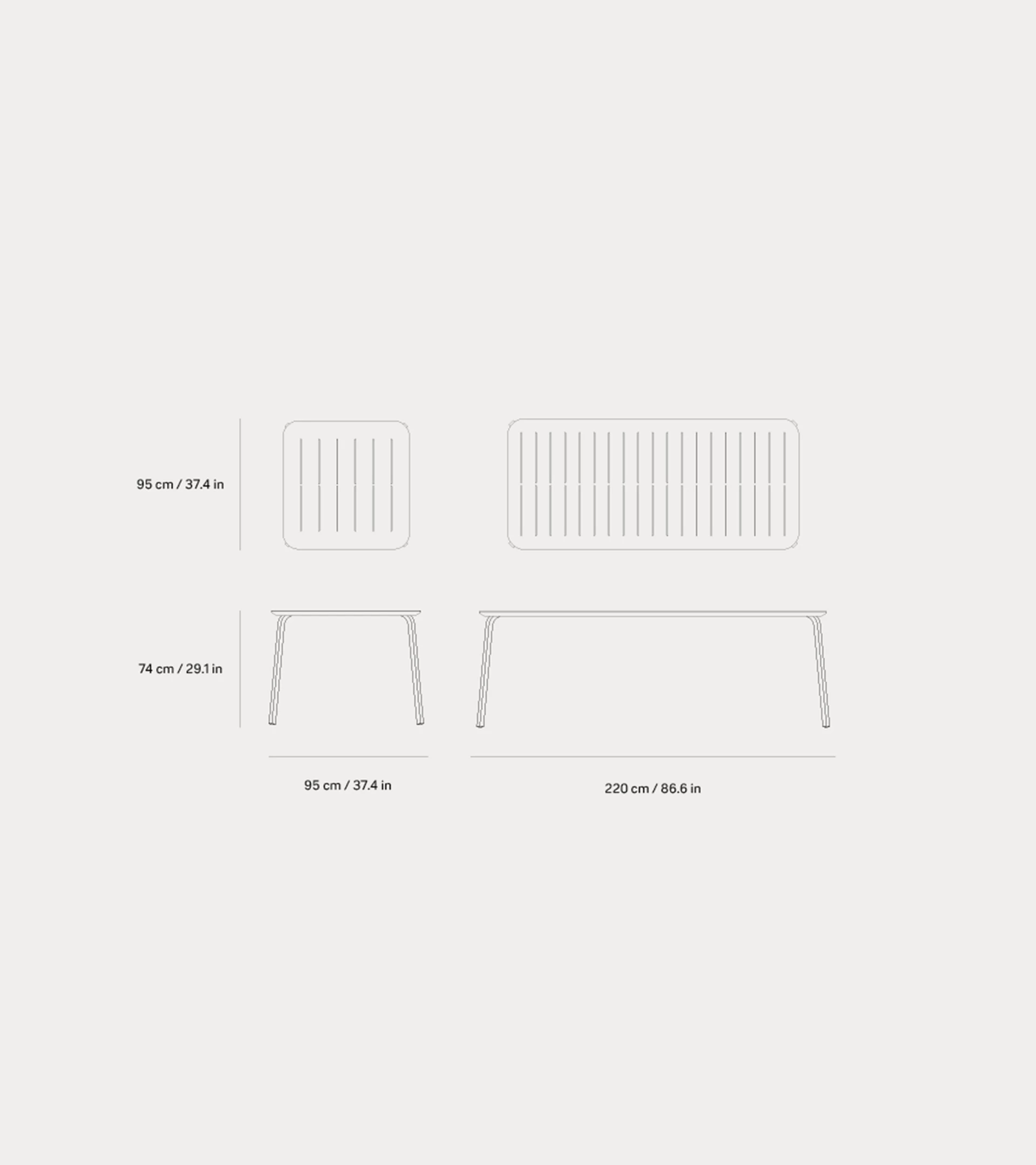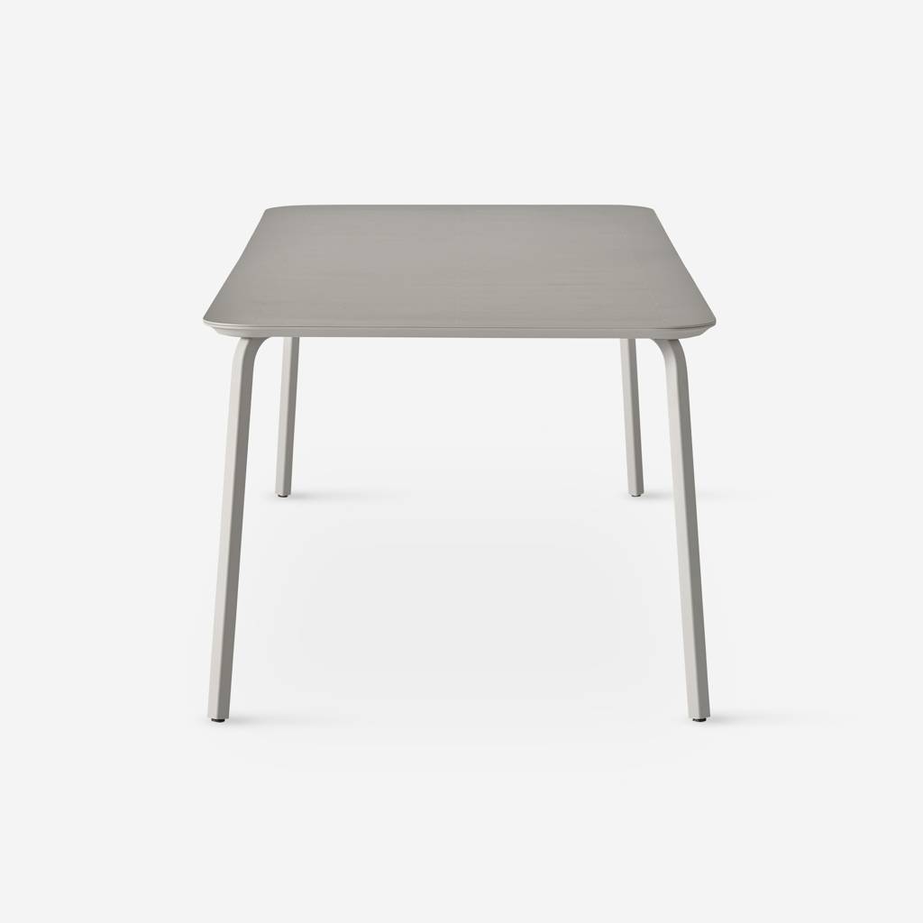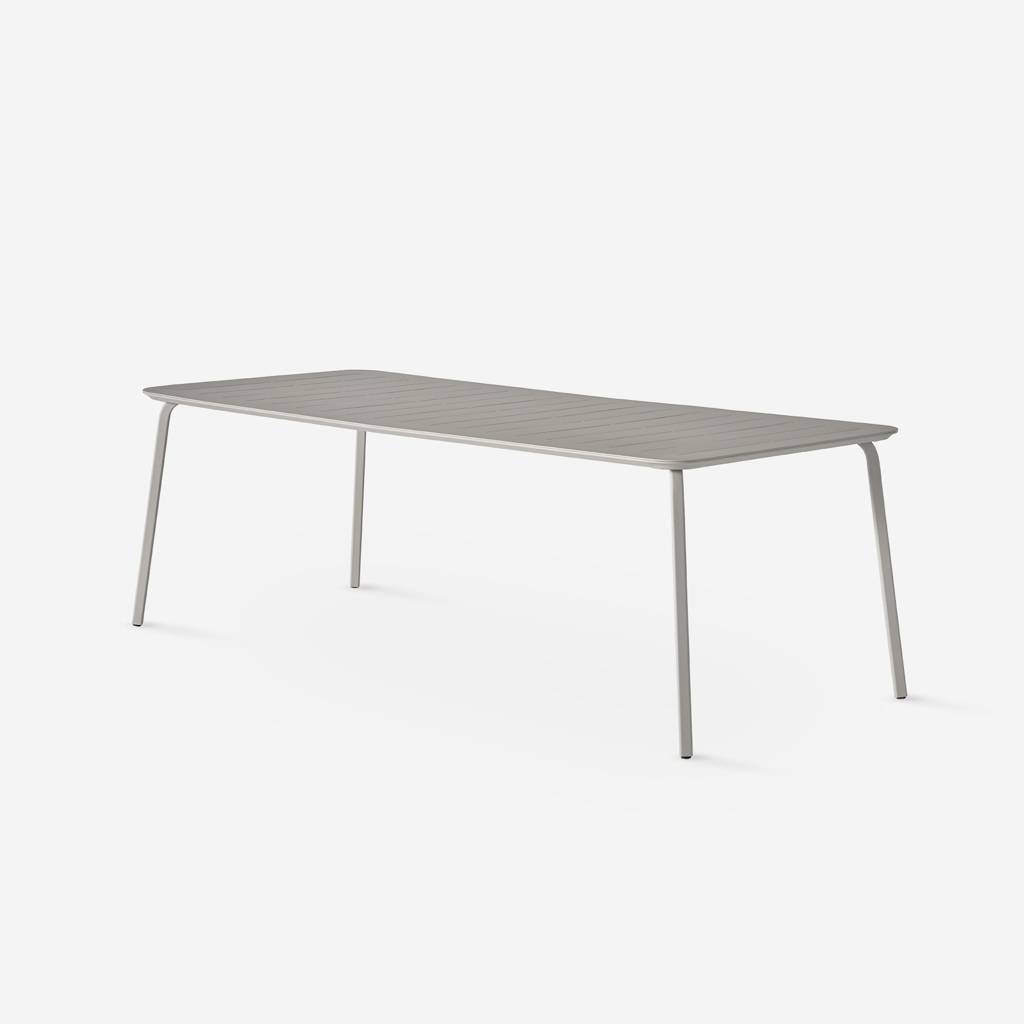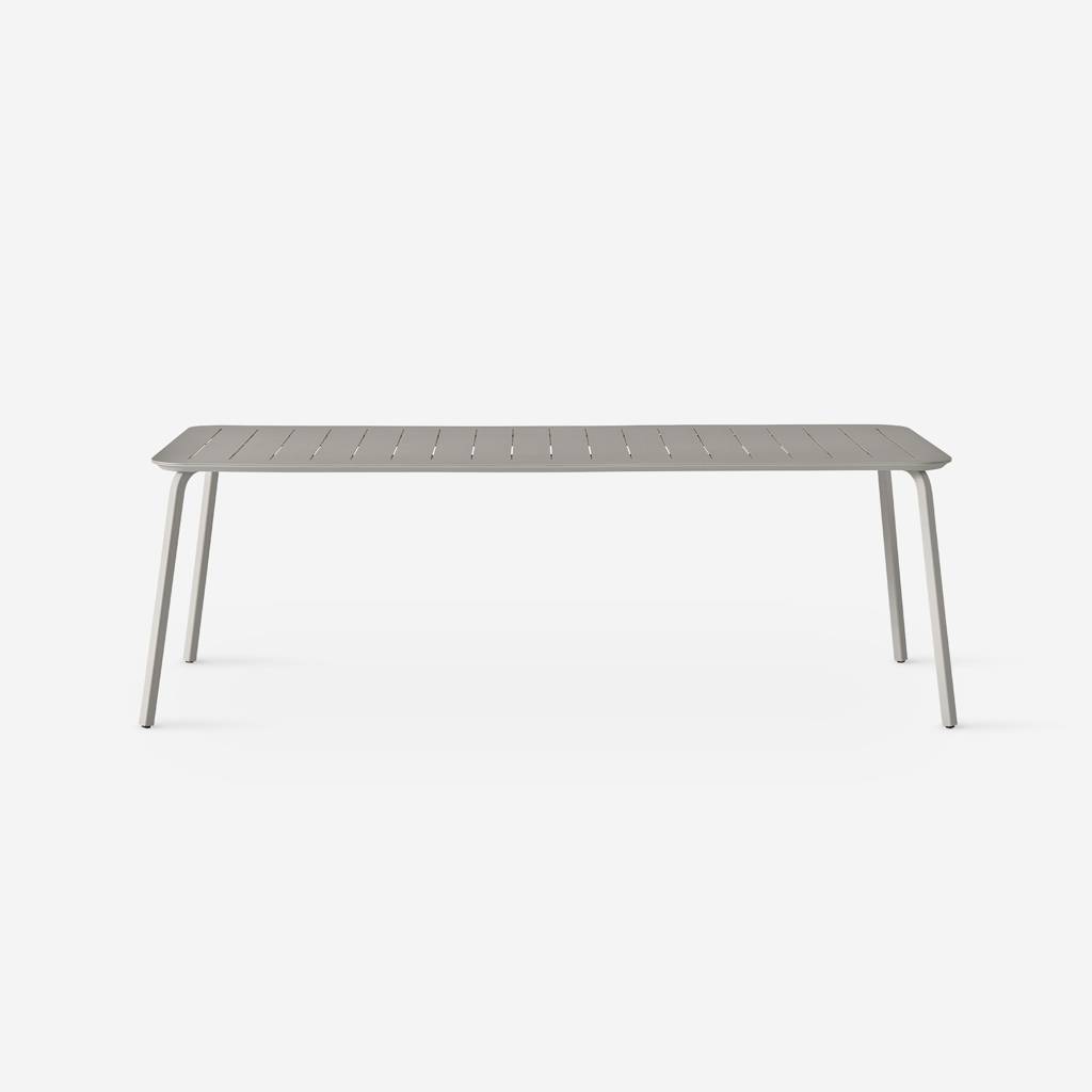 Nowy stół jadalny, dostępny w dwóch rozmiarach, dołącza do kolekcji mebli ogrodowych Vipp Lagrasse. Charakteryzuje się blatem z malowanego proszkowo aluminium i ocynkowanymi, malowanymi proszkowo nogami ze stali, a równoległe rowki rozciągają się na całej szerokości, nawiązując do lekkiego charakteru kolekcji.