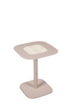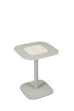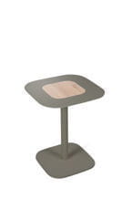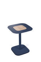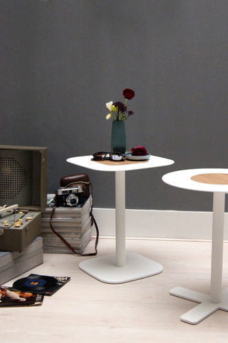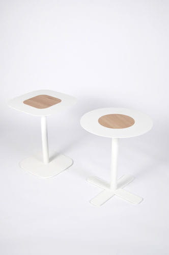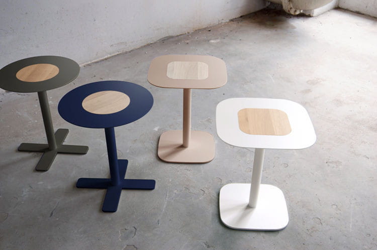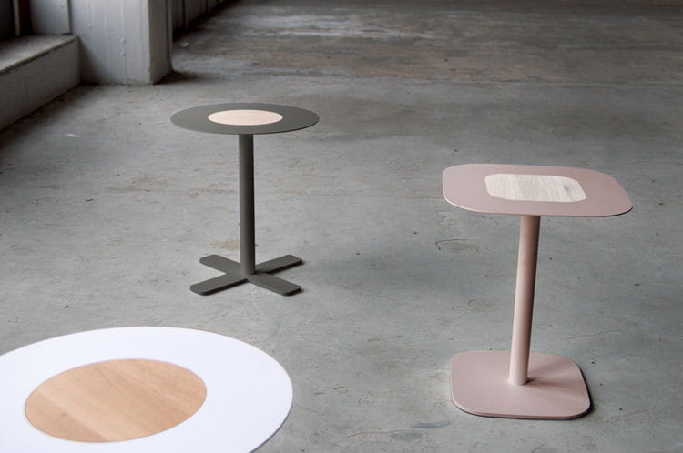Stolik metalowy Blush od Spell, wykończenie drewniane. Dostępny w wersji kwadratowej i okrągłej, wykończony orzechem i dębęm, w różnych wersjach kolorystycznych.