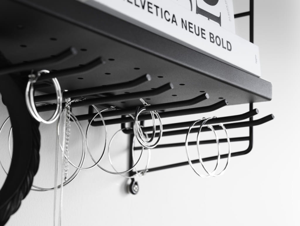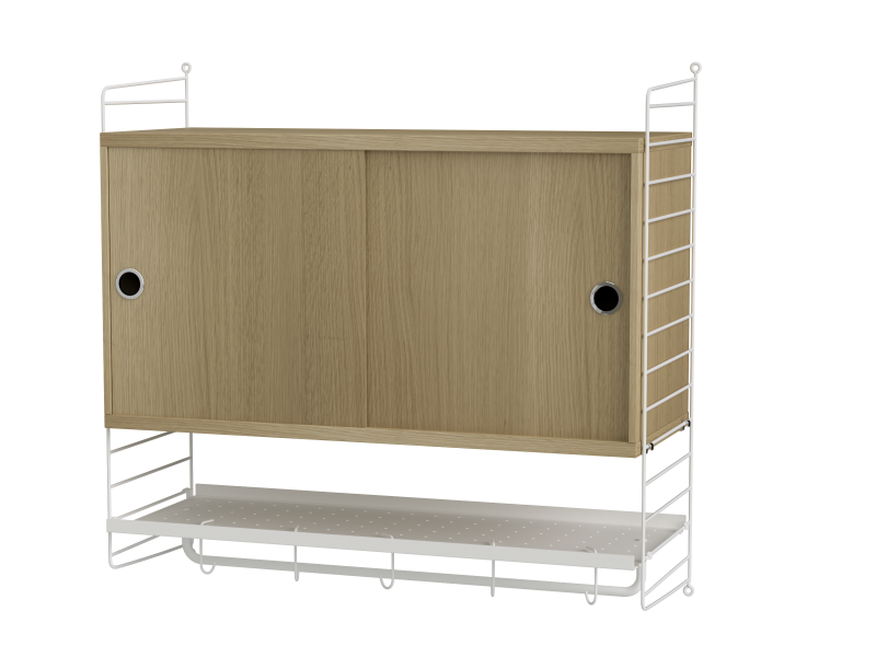 Konfiguracja ścienna z przesuwanymi drzwiami, pozwala na przechowywanie tam cennych rzeczy wraz z metalową półką tworzą elegancką i funkcjonalną całość. Wzbogać swoją konfigurację o metalowy drążek i haczyki aby dodatkowo zwiększyć jej użyteczność.