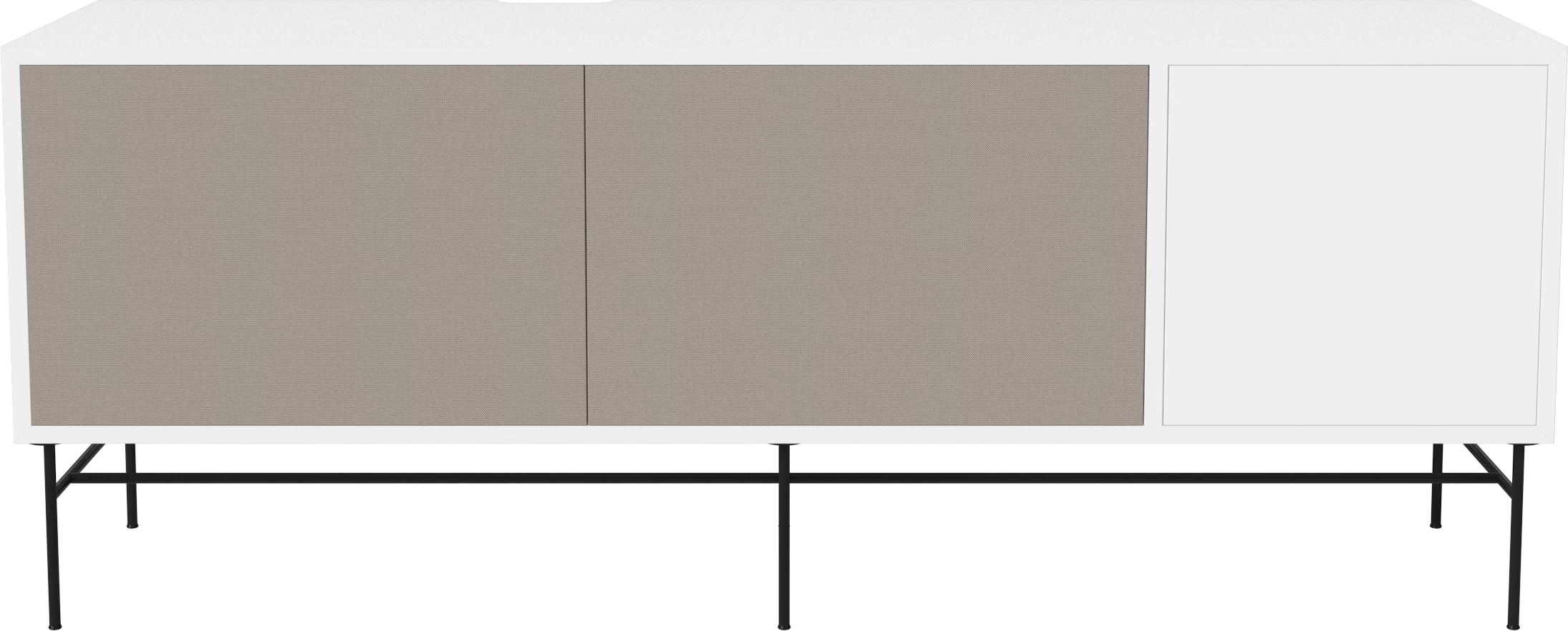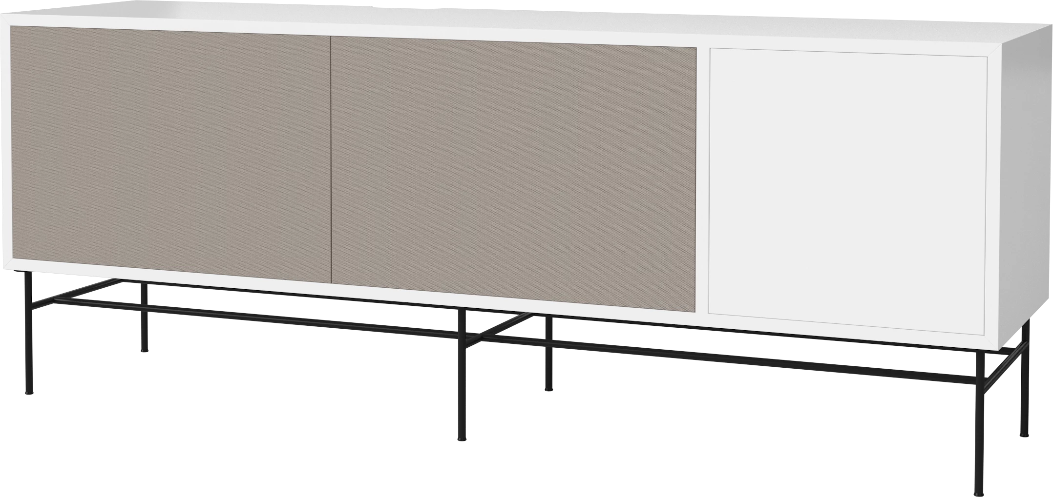 biały MDF, czarna podstawa, szare fronty z tkaniny